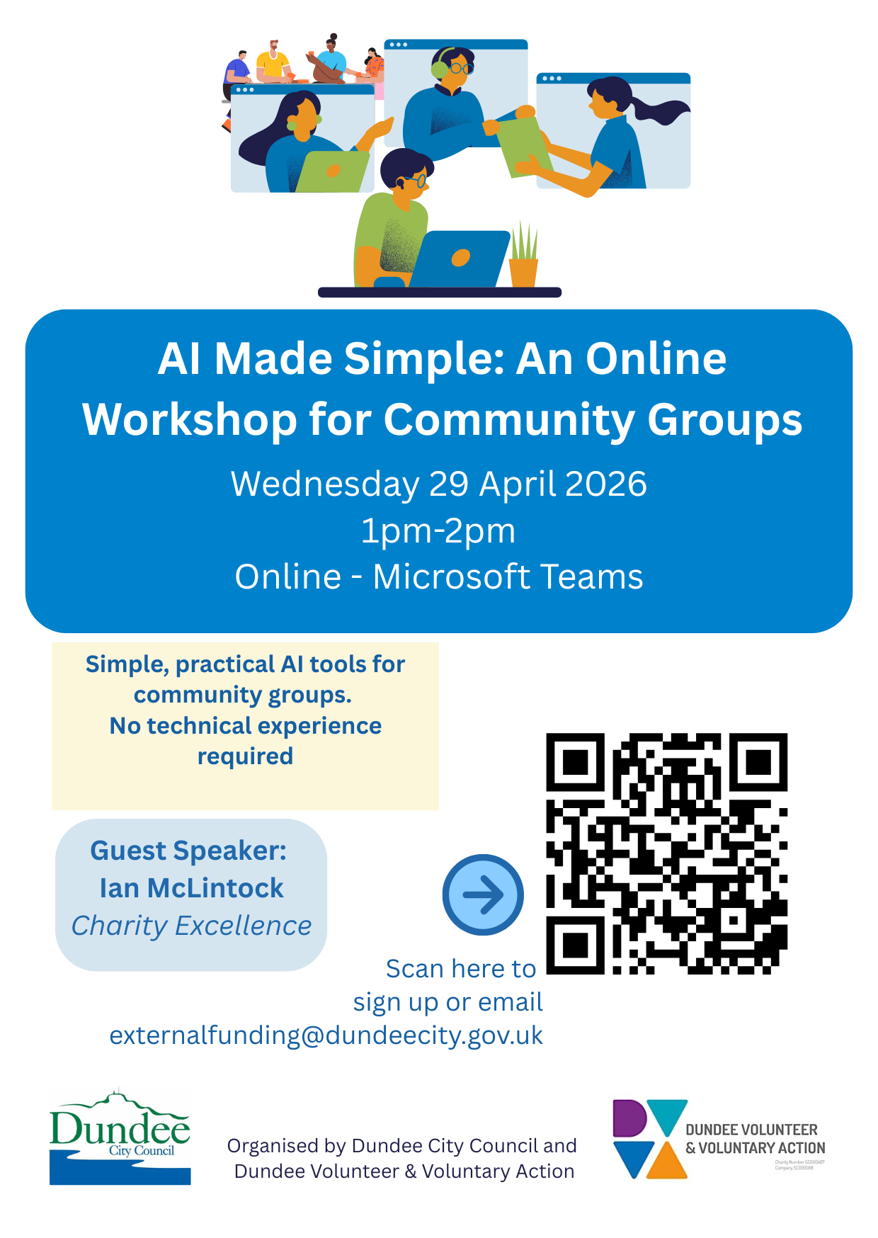 Our next online lunchtime session will take place 1pm-2pm on Wednesday 29 April and will be on AI Made Simple: A Guide for Community Groups, delivered in partnership with Dundee City Council and Dundee Volunteer & Voluntary Action (DVVA).