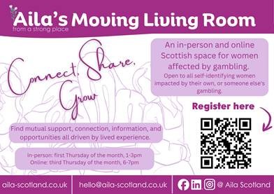 Aila’s Moving Living Room is a monthly in-person and online space for women impacted by their own, or someone else’s, gambling. Our groups offer support, connection and community, whatever the circumstances.