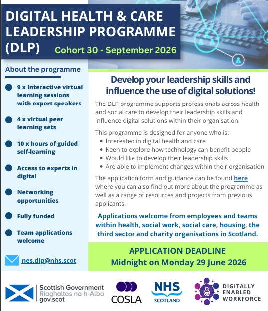 Designed for anyone who would like to develop their leadership skills and is interested in digital health and care, we welcome applications from employees in health, social care, social work, housing, charities and the third sector based in Scotland. More information about the programme, including application guidance can be found on the DLP site.