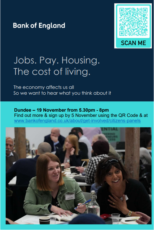 The Bank of England are holding a Citizen’s Forum meeting here in Dundee on the 19th November and looking to add to their Citizen’s Panel. Sign up can be done via: Citizens’ Forum | Bank of England.