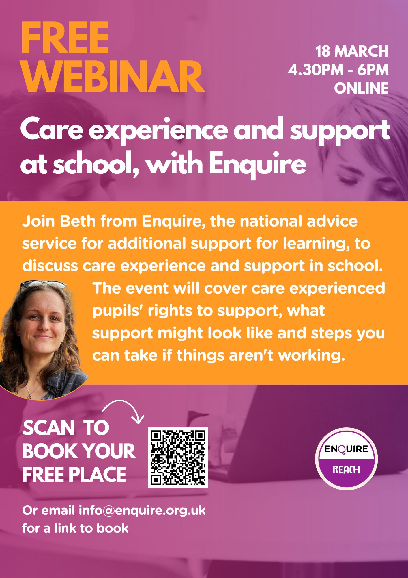 Beth from Enquire is holding a free upcoming webinar on ‘Care Experience and Support at School’, on Wednesday the 18th of March 4:30-6pm.  The session is aimed at all adults who work with or support care experienced children and young people.