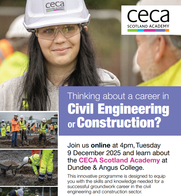 Interested parties can now apply for D&A College’s CECA Academy starting 19th January 2026. The CECA Scotland Academy is a pathway into employment for civil engineering, focussing on groundworks.