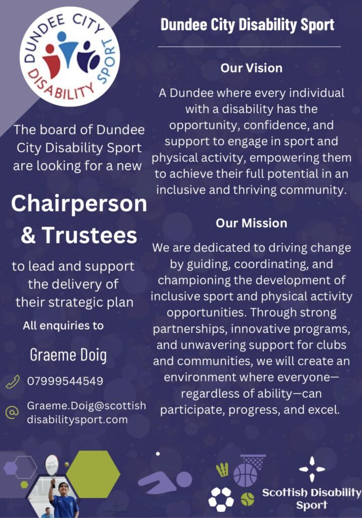 Dundee City Disability Sport are seeking an inspiring and committed leader to take on the role of Chair at their organisation. This is a rewarding opportunity to champion inclusive sport across Dundee, support athletes of all abilities, and help shape the strategic direction of disability sport in the city.