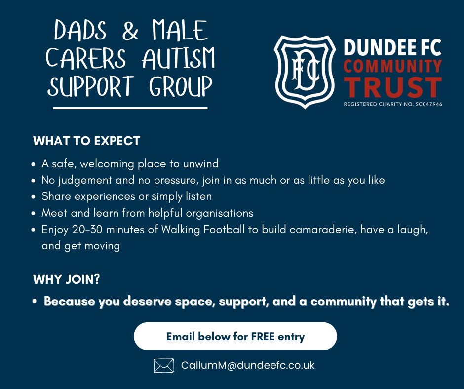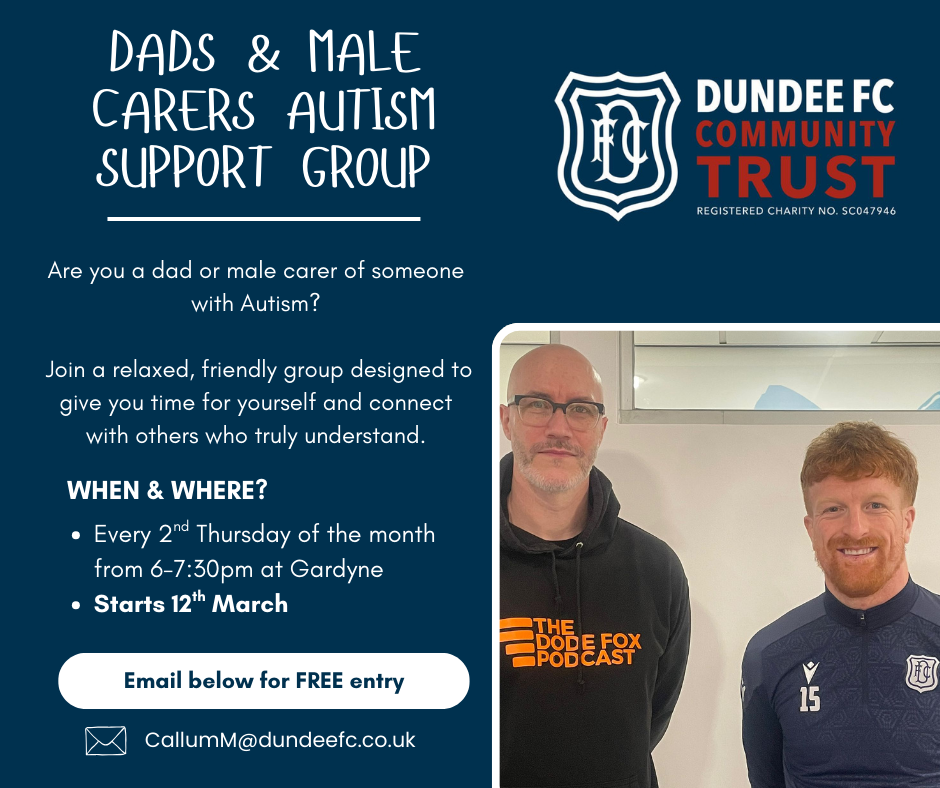 Dundee FC Community Trust are starting a monthly support group for dads and male carers of individuals with autism, on the second Thursday of every month at D&A College Gardyne Campus.