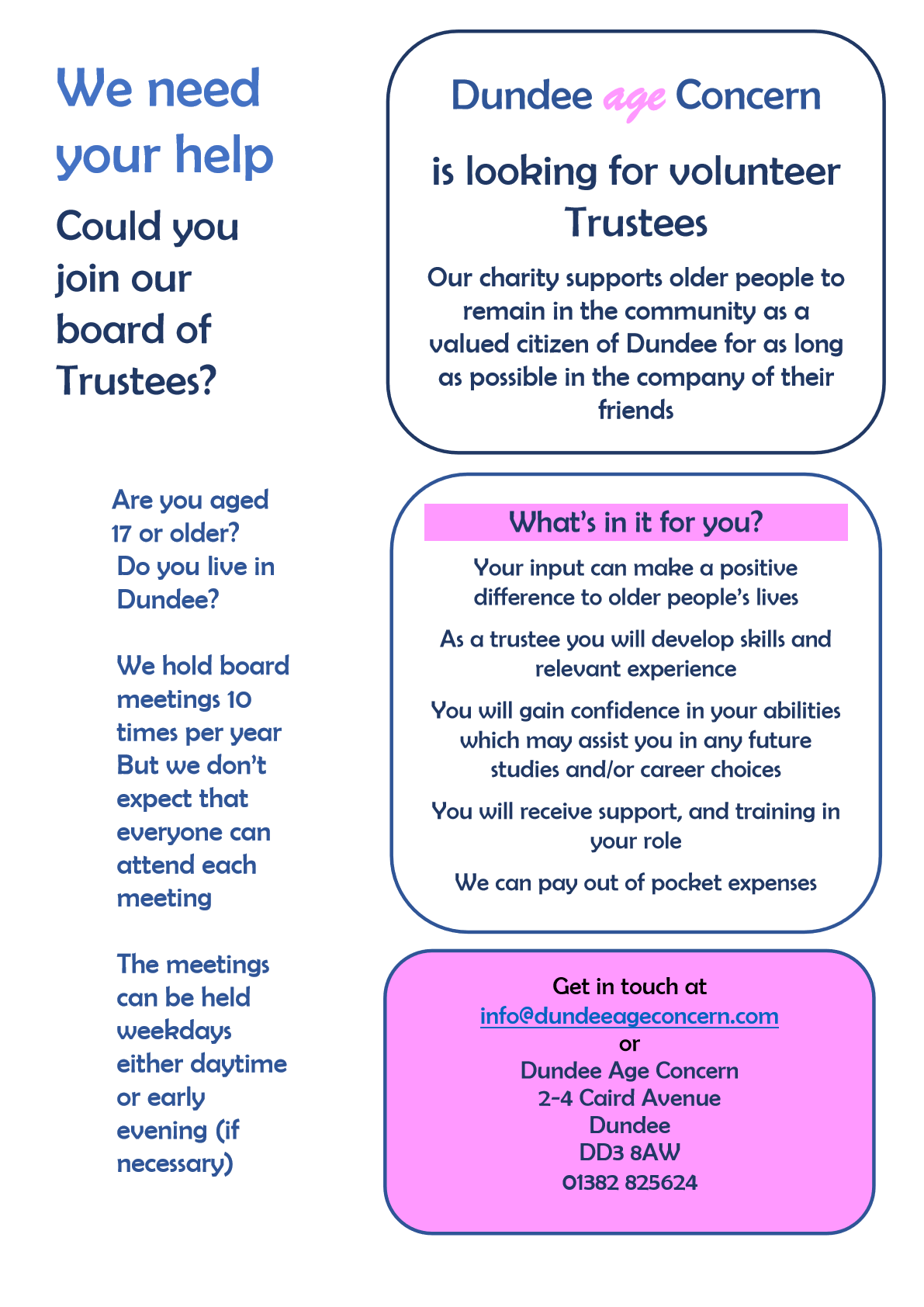 Dundee Age Concern is a local charity looking for replacement Volunteer Chairperson and Trustees from various backgrounds to help in the running of the organisation. Known locally as Fiveways Day Care Centre, we cater for the health and wellbeing of Dundee people who may be isolated and in need of social activity.