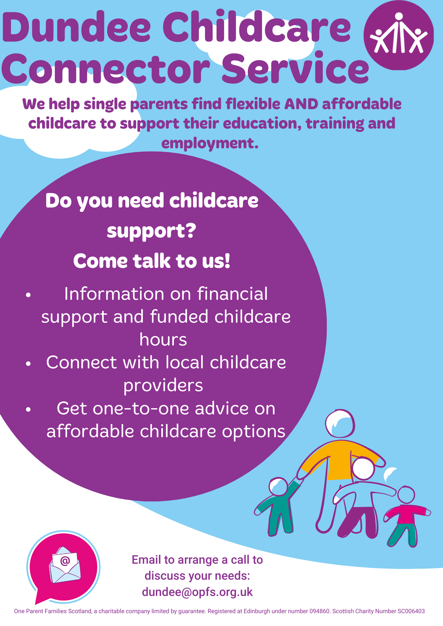 If you are a single parent and think you could benefit from our Childcare Connector Service, get in touch at dundee@opfs.org.uk to arrange a call and discuss your needs.