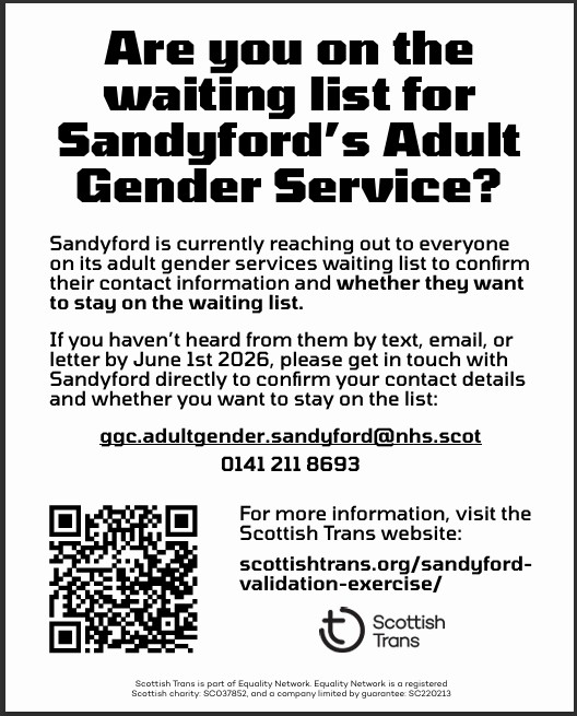 Sandyford Adult Gender Service in Glasgow is carrying out an exercise where they get in touch with everyone on their waiting list, and Scottish Trans (a charity working to improve trans equality, human rights and inclusion) are asking for help to spread the message to the trans community in Scotland.