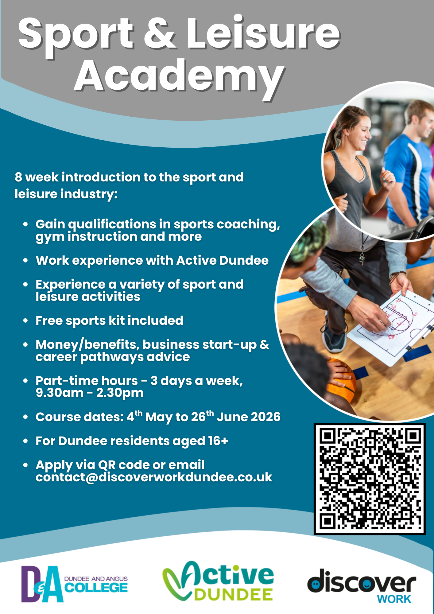 Sport & Leisure Academy is an 8 week training course giving participants an introduction to the sport and leisure industry. Delivered in partnership with Dundee & Angus College and Active Dundee, this unique offer is sure to get you moving and thinking about the huge range of opportunities in this industry.