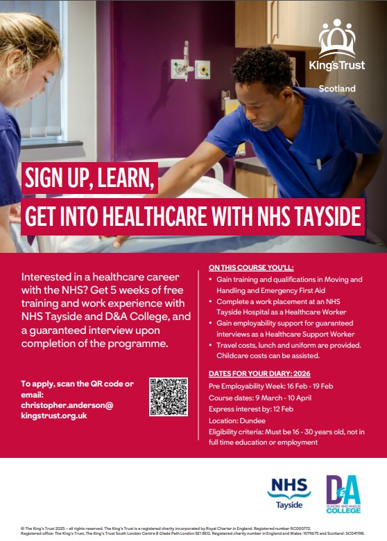 Applications are now open for The King’s Trust Get Into Healthcare programme in partnership with NHS Tayside and Dundee and Angus College.