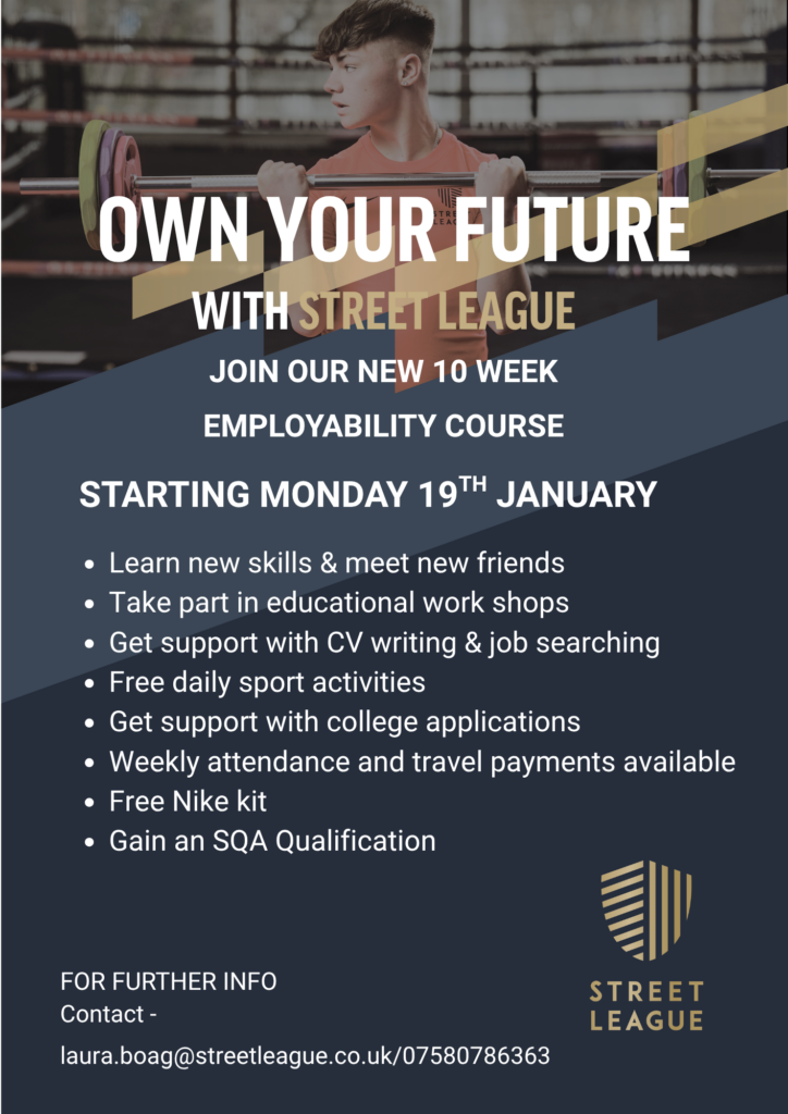 Street League have two upcoming opportunities for young people in Dundee. See Attached flyers or details below for more information. For referrals and further enquiries please contact Adam on adam.wilkinson@streetleague.co.uk