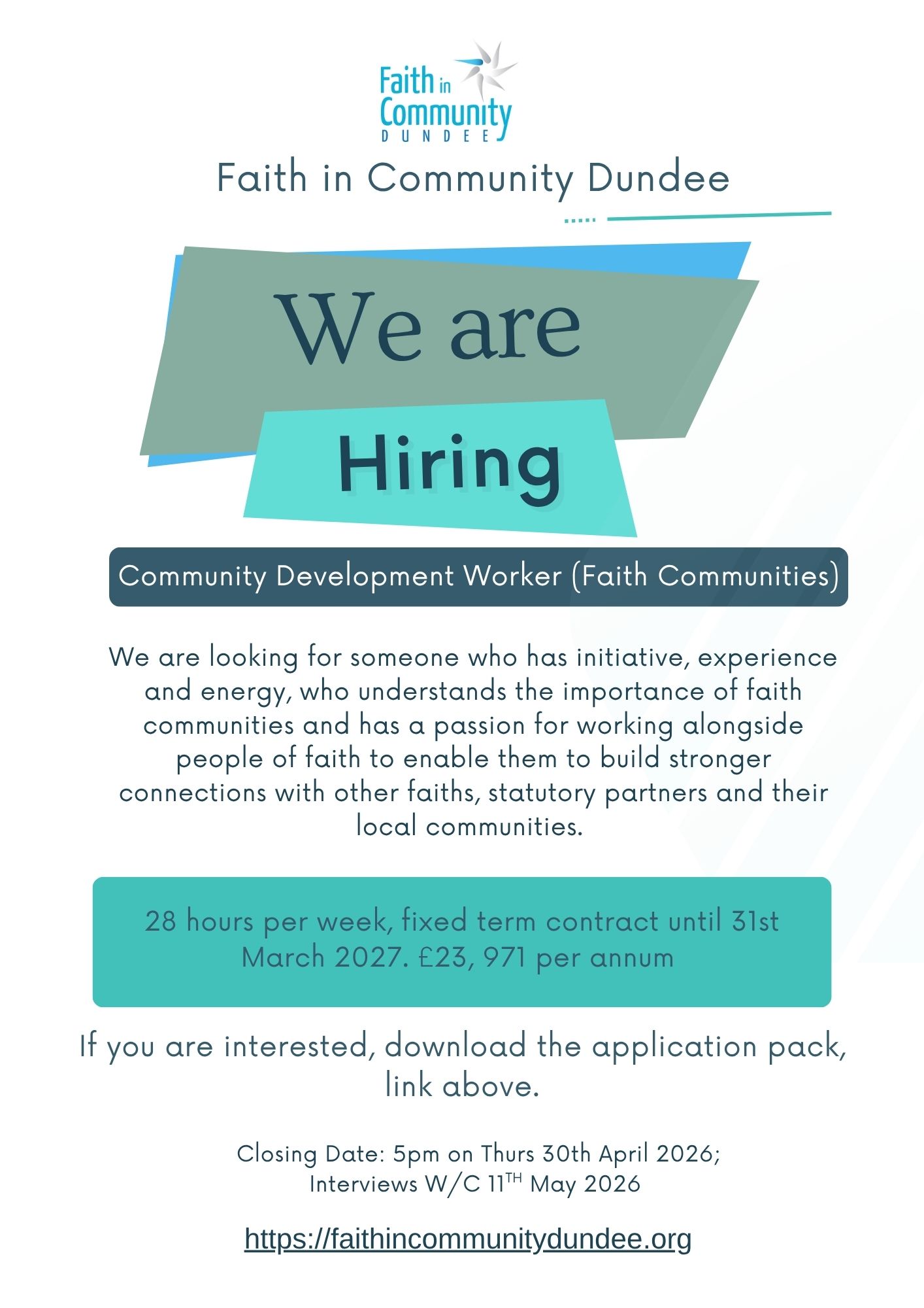 Faith in Community Dundee are looking for a new Community Development Worker (Faith Communities). The application pack can be found here and some additional details can be found in the below. The closing date is 5pm on Thurs 30th April.